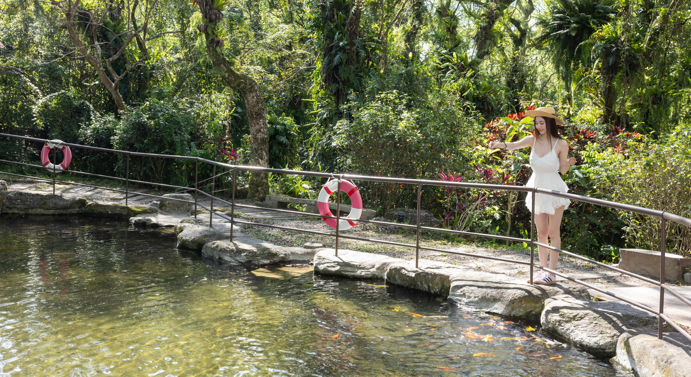 晶瑩的水面映照著周圍翠綠山林,池中魚兒自在穿梭,水面泛起細碎漣漪,彷彿與大自然悄悄對話,帶來一段靜謐而溫柔的時光。
