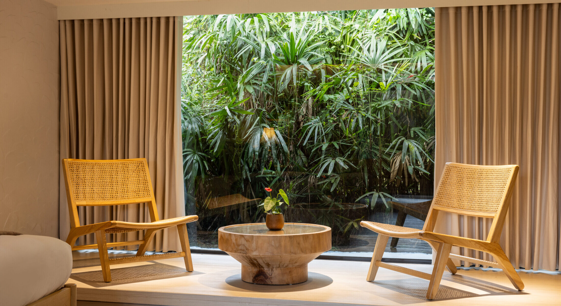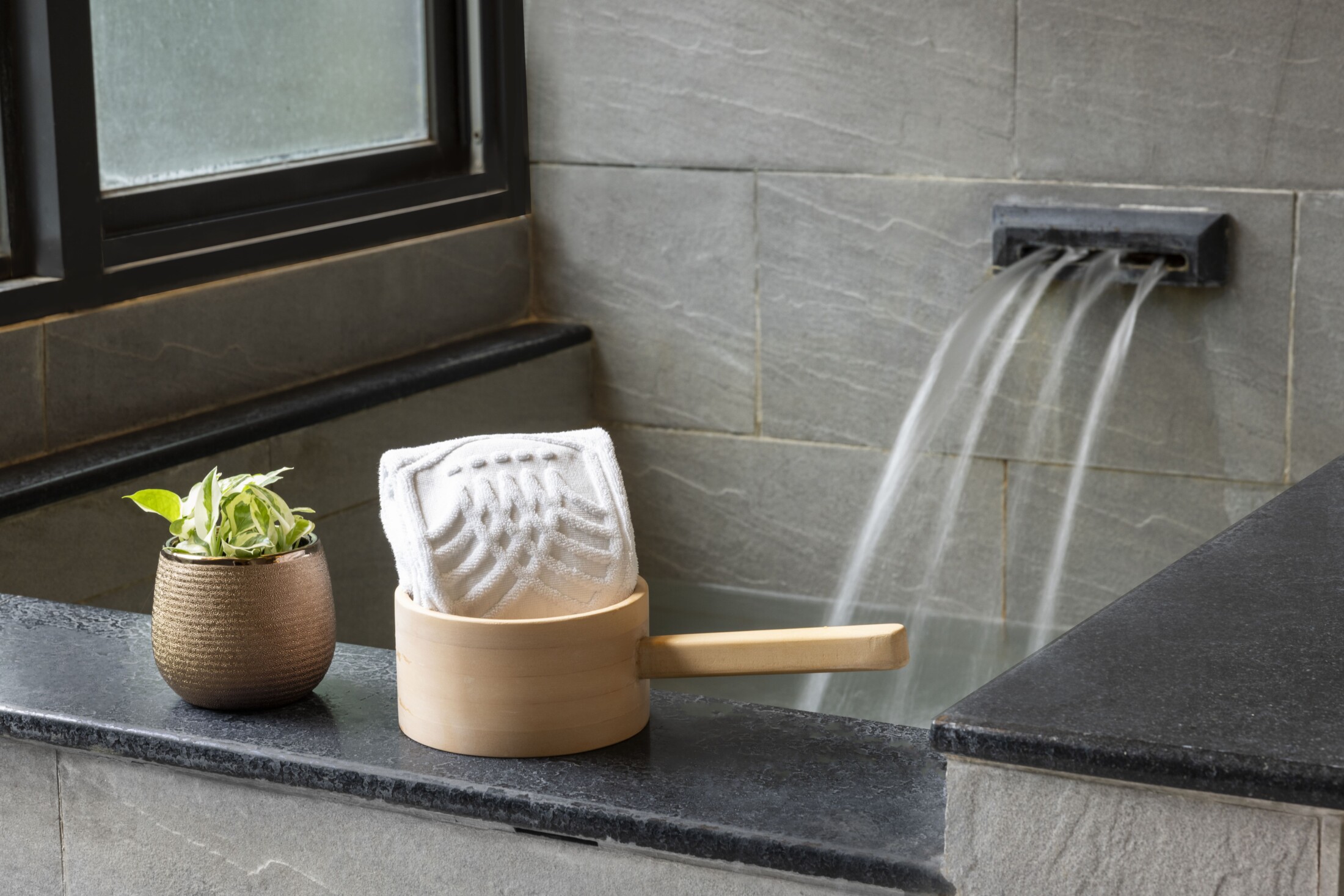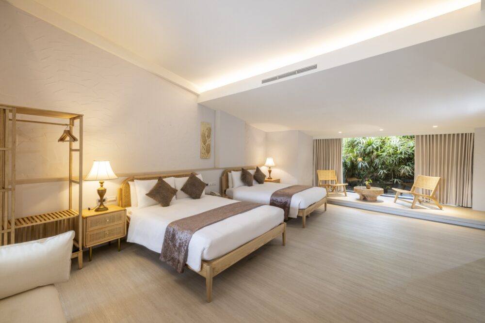 和風溫馨家庭房以簡約線條與木質調打造寬敞空間,兩張舒適雙床伴隨柔光灑落,散發安定沉靜的氛圍。窗邊臥榻與茶几,是午後品茗或閒坐閱讀的靜心一隅。浴室雙洗手槽設計貼心便利,乾濕分離的空間明亮整潔,搭配溫泉池畔微霧繚繞,讓每一次沐浴都是靈魂與自然對話的時刻。
